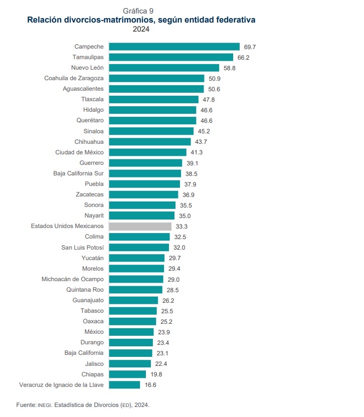 Un dato relevante es la relación entre divorcios y matrimonios, ya que en San Luis Potosí se registraron 32 divorcios por cada 100 matrimonios, cifra superior al promedio nacional de 33.3, lo que indica que aproximadamente una tercera parte de los matrimonios tiene como contraparte una disolución legal. Aunque no se trata de uno de los porcentajes más altos del país, sí evidencia un incremento sostenido respecto a años anteriores.