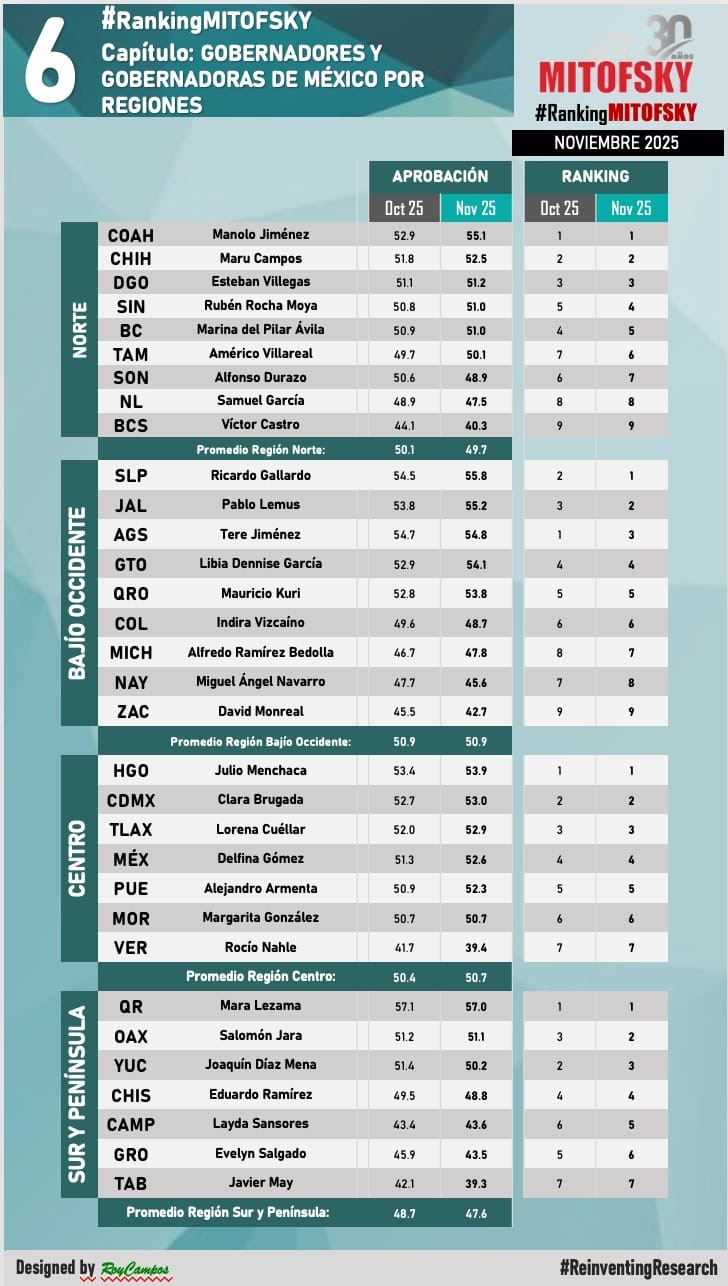 La región norte es liderada por Manolo Jiménez de Coahuila, seguido de Maru Campos (Chihuahua) y Esteban Villegas (Durango). El peor evaluado es Víctor Castro de Baja California Sur, afectado por una caída notable en su aprobación.
