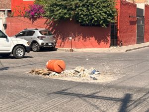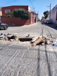 A más de un mes de haber sido denunciado públicamente, el socavón con fuga de agua ubicado en la calle Pedro Vallejo, esquina con 5 de Mayo y Juan Zarco, en el barrio de San Juan de Guadalupe, continúa sin ser atendido por las autoridades municipales.