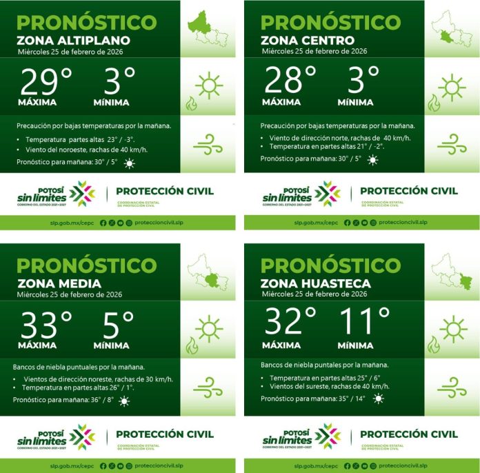 La Coordinación Estatal de Protección Civil, informa que habrá temperaturas calurosas por la tarde con probabilidad de heladas principalmente por la mañana en sierras de las zonas Centro y Altiplano.