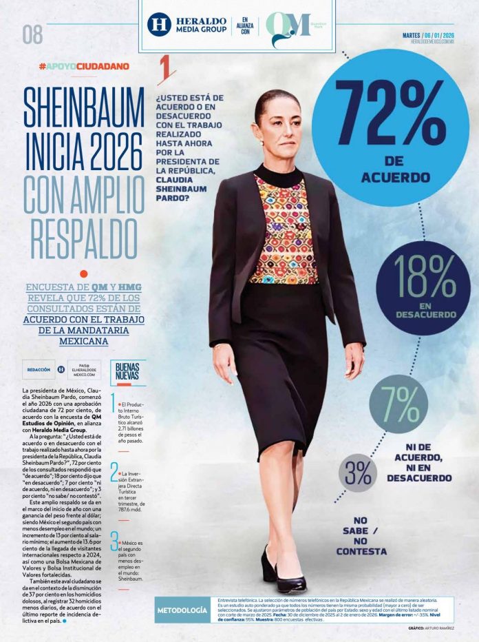 La presidenta de México, Claudia Sheinbaum Pardo, comenzó el año 2026 con una aprobación ciudadana de 72 por ciento, de acuerdo con la encuesta de QM Estudios de Opinión, en alianza con Heraldo Media Group.