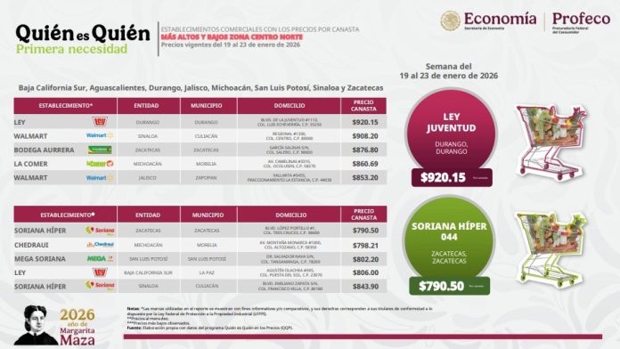 En el mismo periodo, otros establecimientos de la zona Centro-Norte, que comprende estados como Aguascalientes, Jalisco y Sinaloa, registraron precios significativamente más altos, llegando hasta los $920.15 en Durango.